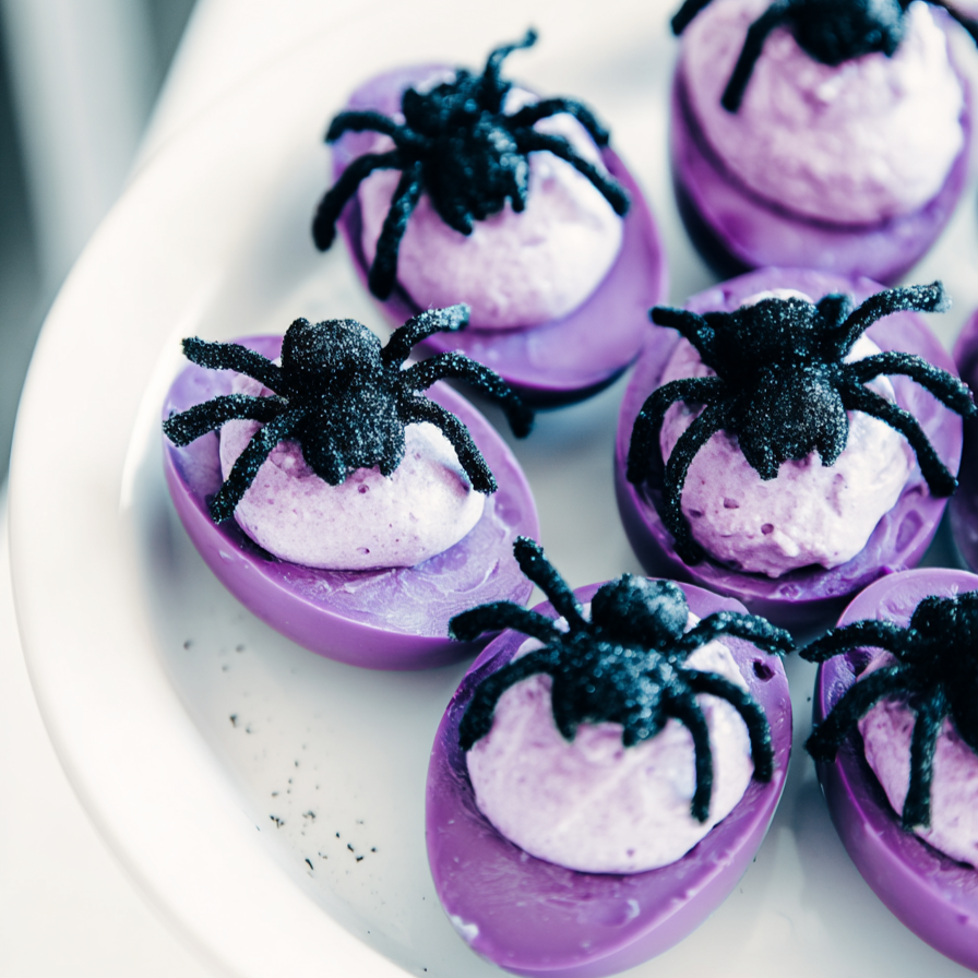 Finger foods are a must for Halloween gatherings, and these spooky deviled eggs are an easy, festive option. Dyed a creepy purple and garnished with eerie toppings, they’re just the right mix of fun and flavor to make your snack table stand out.