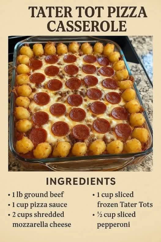 Add cheese & tots: Sprinkle 1 cup of mozzarella over sauce, layer tater tots, then top with remaining cheese and pepperoni.