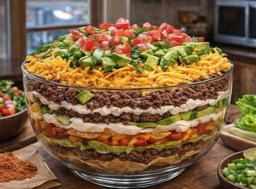 In a large serving bowl or trifle dish, spread the chopped lettuce evenly as the bottom layer.