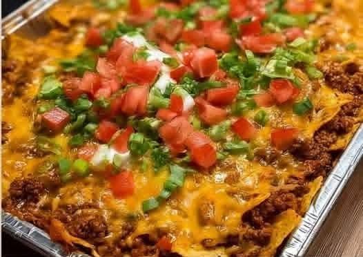 Remove from the oven and top with remaining crushed chips, diced tomatoes, and green onions.