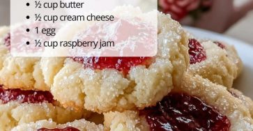 Ingredients ½ cup butter, softened ½ cup cream cheese, softened 1 egg ½ cup raspberry jam 1 cup sugar 1…
